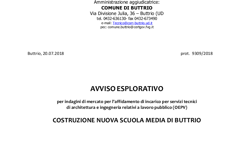 Clicca qui per scaricare i documenti.E’ stato pubblicato l’avviso che si riferisce al procedimento per l’affidamento dell’incarico per lo svolgimento dei servizi di architettura e ingegneria di DIREZIONE LAVORI E CONTABILITÀ, per l’intervento di “COSTRUZIONE NUOVA SCUOLA MEDIA A BUTTRIO”.